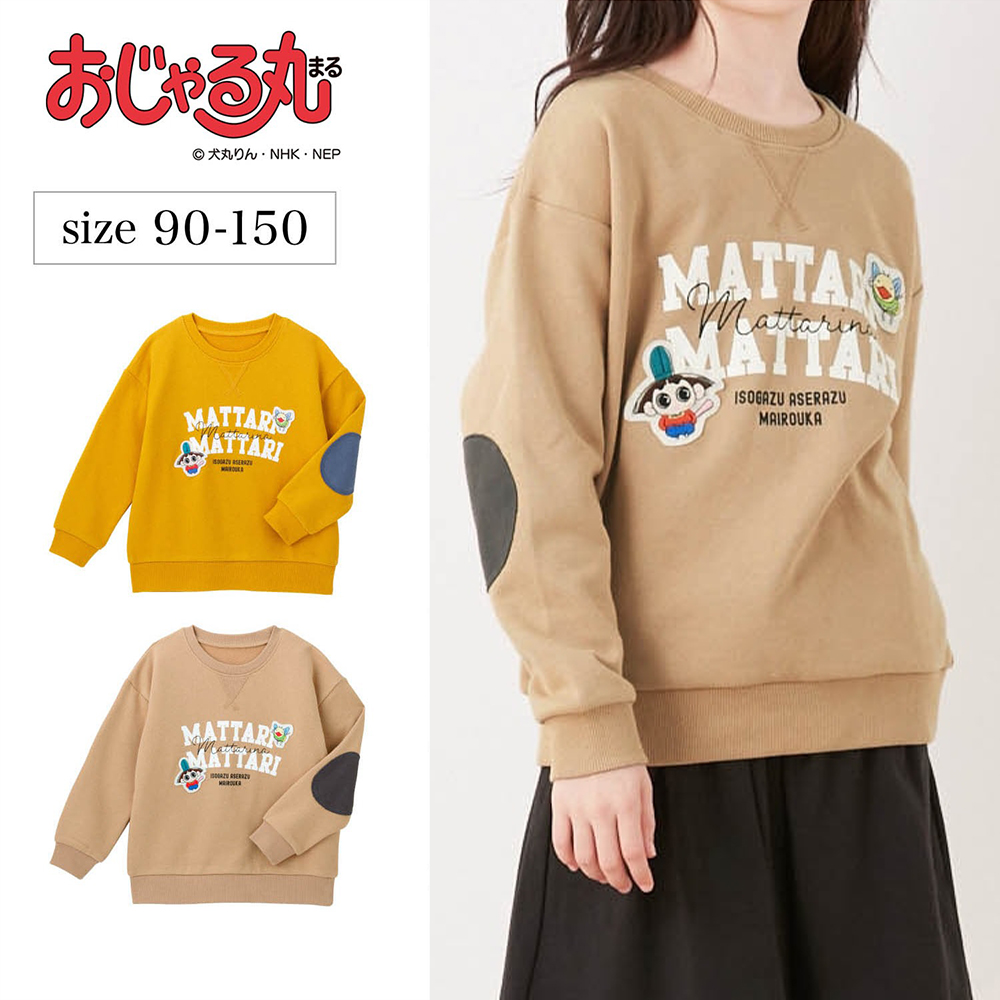 人気キャラクター「おじゃる丸」とのコラボアイテム。ひじパッチの配色がおしゃれなプルオーバーで、裏毛素材で暖かさもバッチリ。お子様も大喜び間違いなしの一着です。